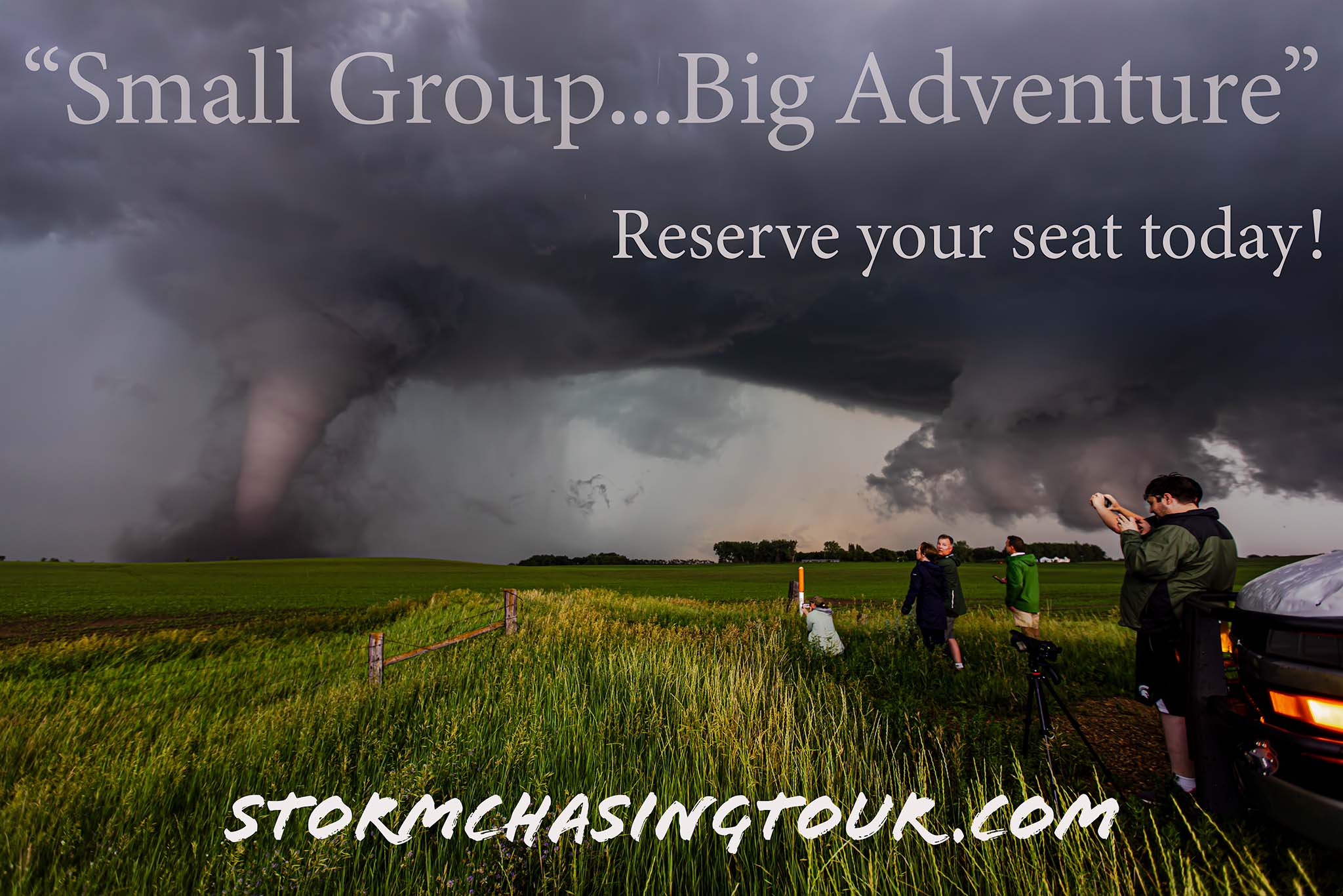 Storm chasing tour guests watch a tornado track across South Dakota.